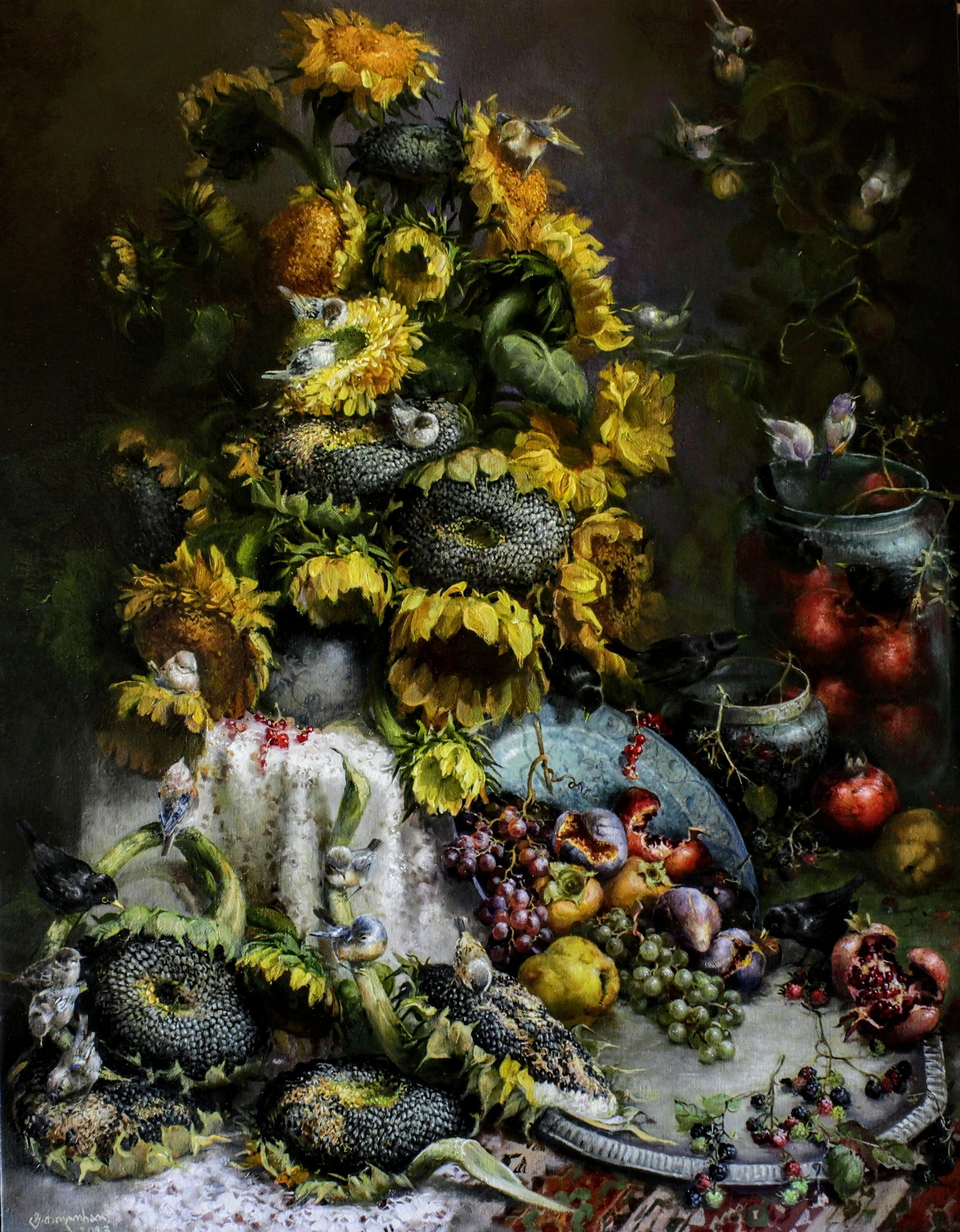 Tariel Toloraia is a Georgian artist celebrated for his vibrant, meticulously detailed still-life compositions that capture the beauty of nature with a sense of reverence and warmth. His art, rooted in classical realism, showcases richly colored flowers, fruits, and birds set against muted backgrounds, creating an intimate, almost theatrical ambiance. Toloraia’s controlled brushwork and use of chiaroscuro evoke a timeless elegance, reminiscent of Baroque still-life traditions, while his inclusion of animals like birds adds a playful, lively dimension. His works invite viewers to pause and appreciate the transient beauty of everyday life, blending technical mastery with a heartfelt appreciation for nature’s abundance.